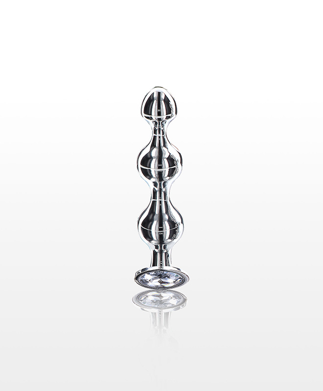 Disse analkulene kombinerer et rent sølvfarget metall med en glitrende glasskrystall i basen. Kulene er symmetrisk plassert og øker gradvis i størrelse, noe som gir en både frekk og elegant visuell effekt. Den glatte overflaten gir en pirrende effekt, perfekt for deg som vil ha både funksjon og stil i én og samme leke.