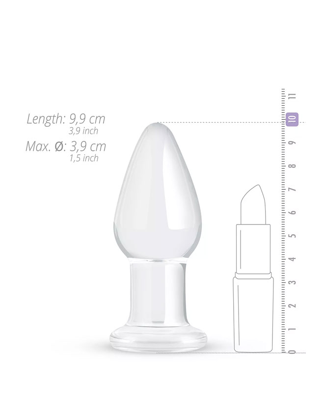 Denne buttpluggen i glass er perfekt for menn og kvinner som leter etter en god analleke! Pluggen er laget av glass og er middels stor med en diameter på ca 3,9 cm.