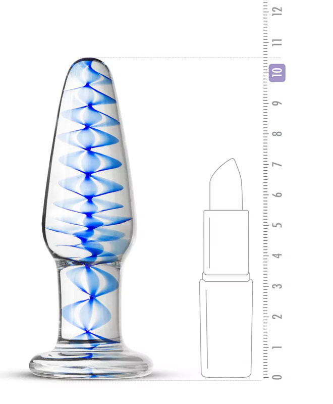Pluggen er tyngre og jevnere enn vanlige buttplugger og har en vakker blå spiral i skaftet. Pluggen kan brukes med alle typer analglidemiddel og er lett å rengjøre etter bruk med vann og leketøysrens.