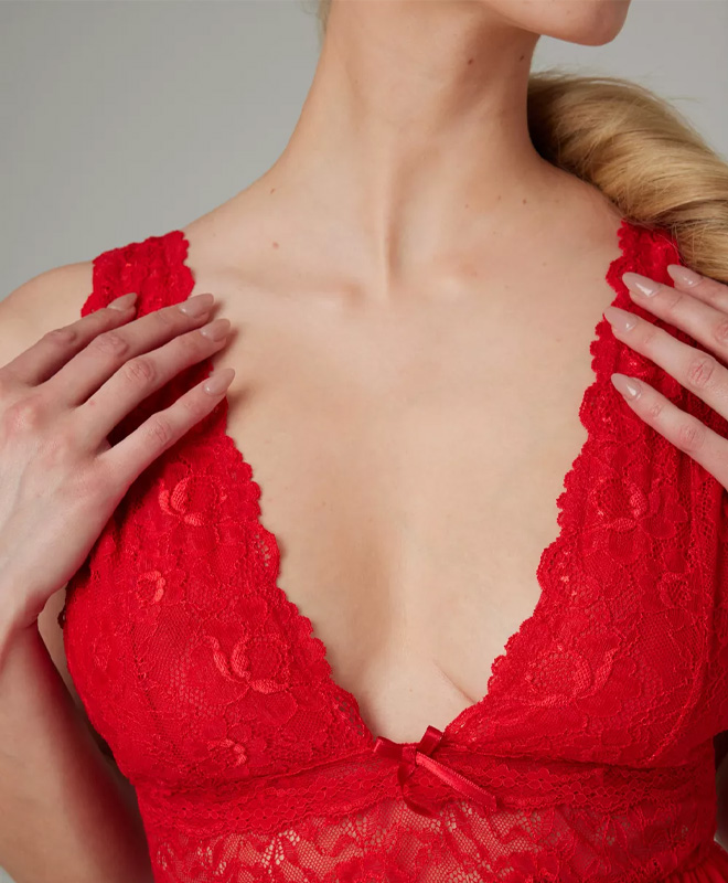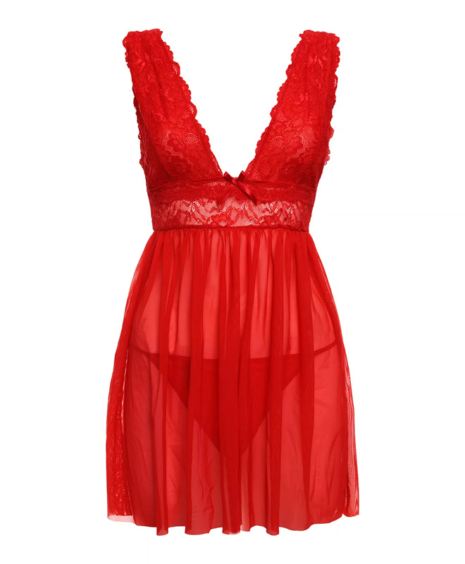 Denne minikjolen fra Christine kombinerer intens rødfarge med delikate blonder og lett, gjennomsiktig chiffon. Blondene på brystet gir en dyp V-utringning som fremhever bysten, mens det løse snittet faller mykt over kroppen. Det lette stoffet skaper en sexy aura som er perfekt når du vil ta styringa på soverommet.
