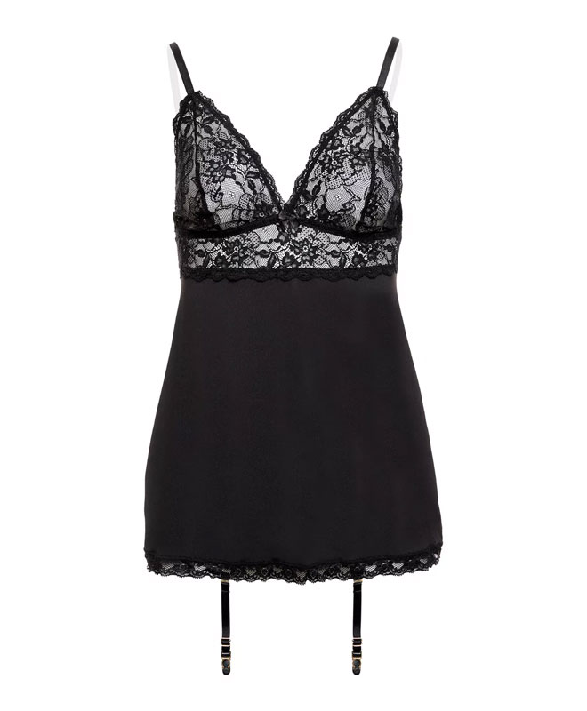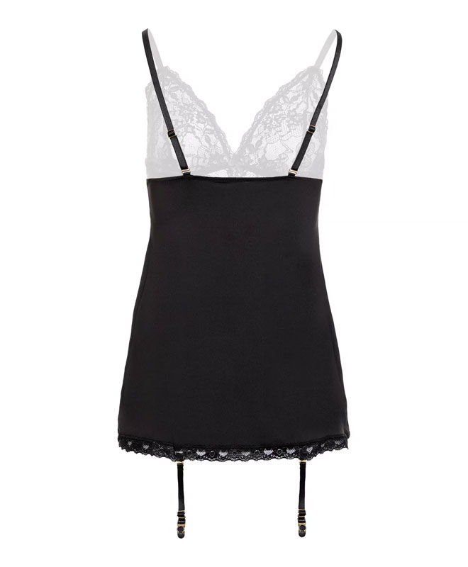 Denne sorte, figurnære kjolen med strømpeholdere er en perfekt blanding av luksus og komfort – og gir deg en uimotståelig og luksuriøs look. Den kan brukes som en forførende minikjole eller som en del av et undertøysett, her er det bare å velge og vrake.