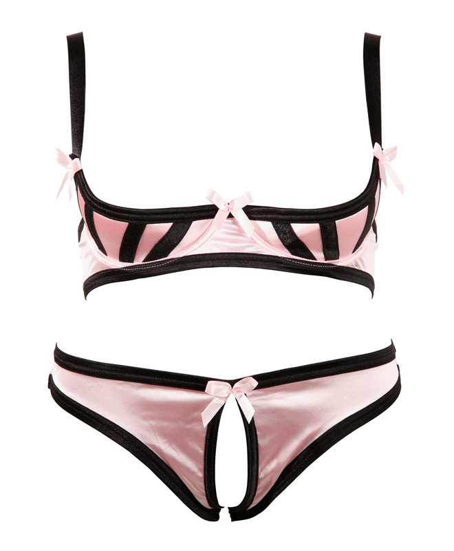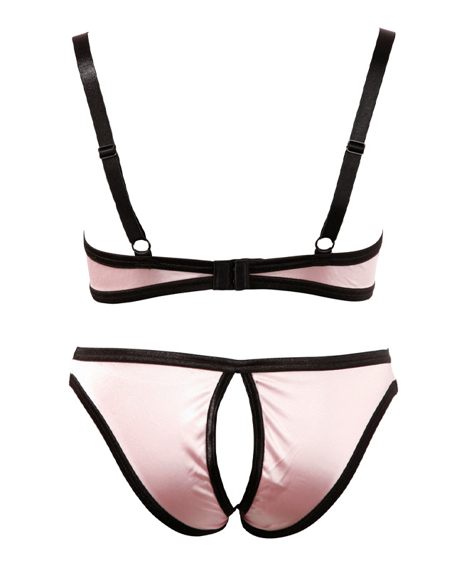 Leter du etter det lille ekstra til kvelden? Dette undertøysettet fra Cottelli Collection blander pudderrosa sateng med svarte detaljer for et lekent, men stilig uttrykk. BH-en med kvartkopper løfter og fremhever bysten, mens små sløyfer og kontrastkanting gir en sexy, feminin finish. Den matchende trusen følger samme stilen, med delikate utskjæringer og åpen skritt for ekstra frekk tilgang.