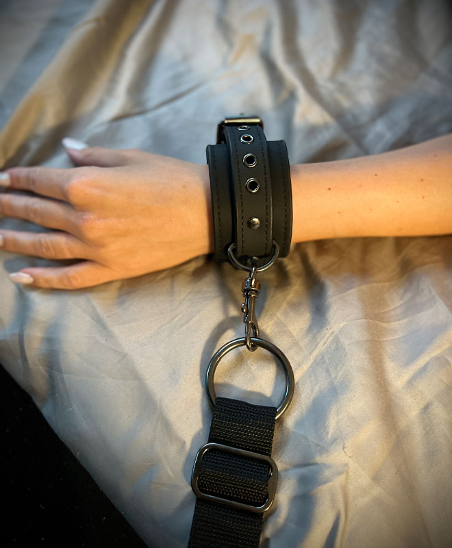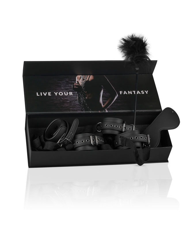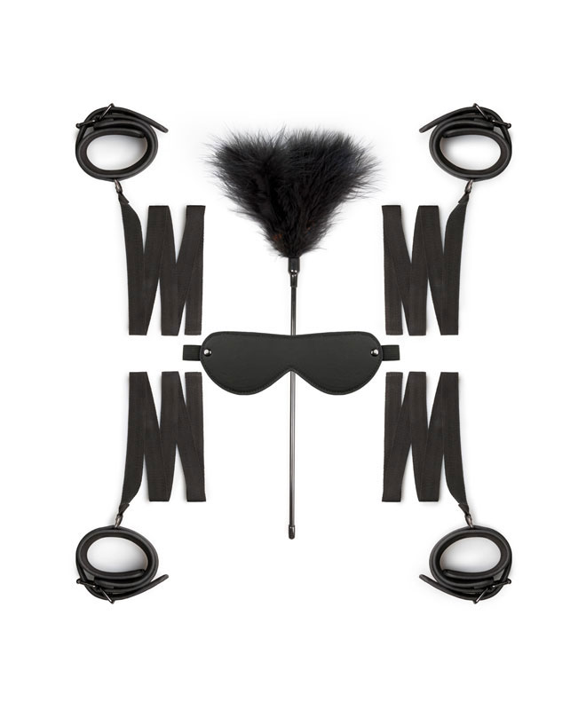 Settet består av håndmansjetter, ankelmansjetter, en øyemaske og en fjærkiler. De fire mansjettene har stropper festet til dem, slik at du kan knytte dem sammen eller knytte dem til sengestolper, stoler, bondage-seler osv. Mulighetene er uendelige!