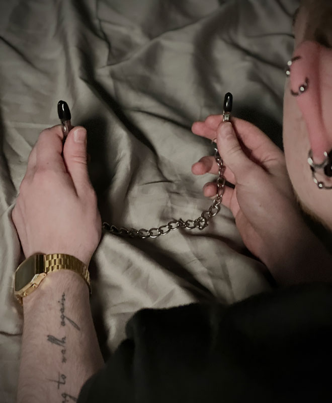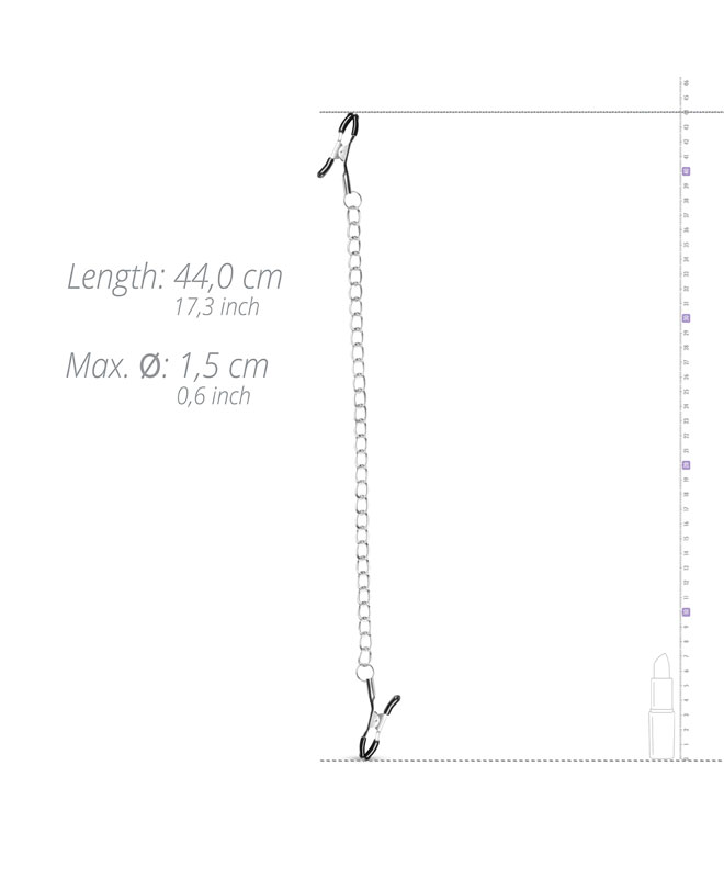 Brystklemmene er utstyrt med en lang metalllenke. Føl hvordan klemmene er tett festet til brystvortene dine, mens det kalde metallet berører og stimulerer kroppen din. Er du klar for en spennende ny opplevelse?