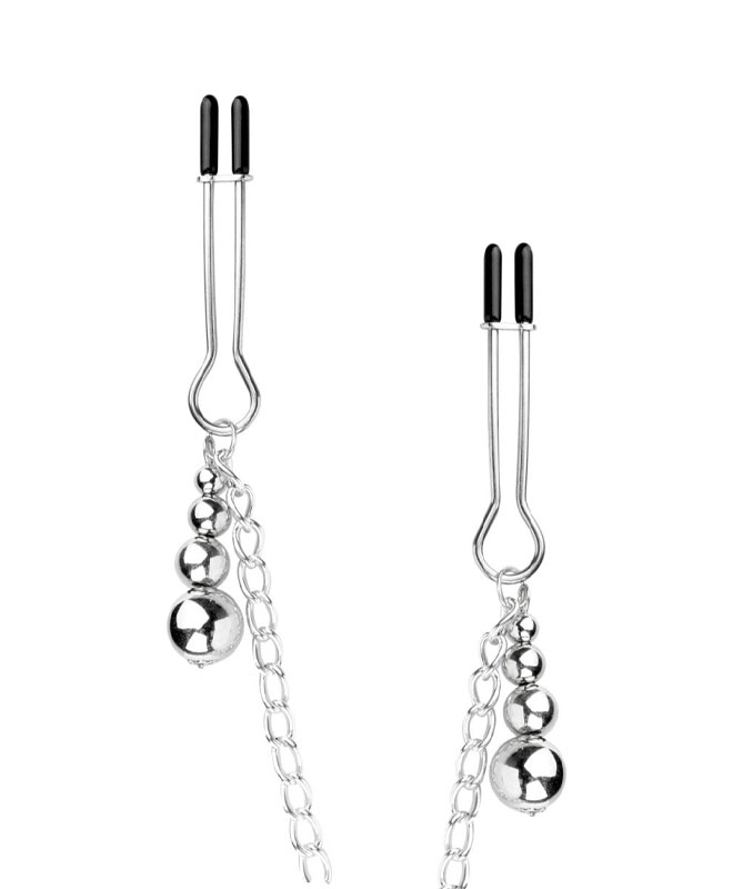 Vil du ta leken til nye høyder? Disse sølvfargede bryst- og klitorisklypene gir deg akkurat den deilige blandingen av smerte og lyst som skrur kåtheten opp til maks. Når klypene biter tak, sender de små elektriske bølger av nytelse gjennom kroppen og med klitorisklypen får du dobbelt så mye pirring på én gang.