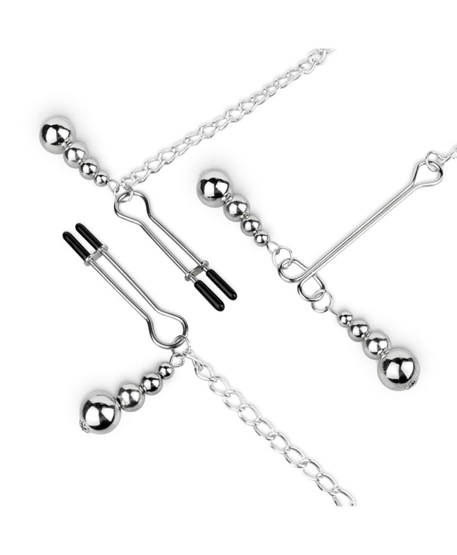Brystklypene er justerbare, slik at du selv kan velge hvor hardt de skal klemme. Start mykt, bygg opp spenningen og la partneren stramme til når du er klar for mer. Klitorisklypen treffer kroppens mest følsomme punkt og gir deg en intens følelse av underkastelse og kontroll.