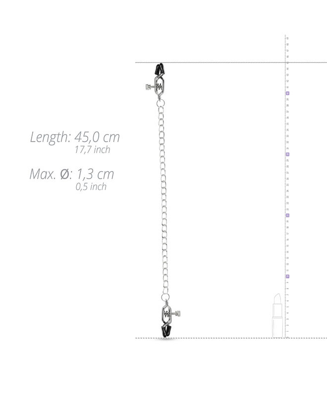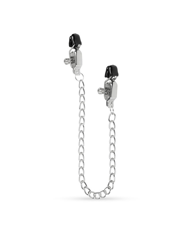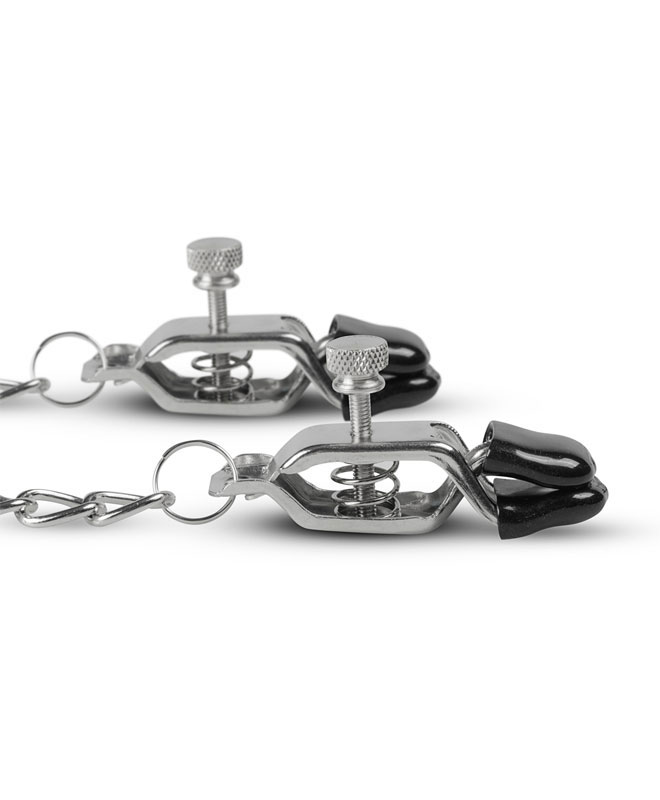 Disse store brystklemmene fra EasyToys Fetish har et rått, metallisk utseende med sølvfarget finish og svarte silikonputer. Den kraftige lenken i mellom legger til et frekt, dominant preg, perfekt for deg som liker litt tyngde og visuell tenning i leken. Klemmene er ca. 5,5 cm lange og lenken måler ca. 32 cm, så hele settet synes godt på kroppen.