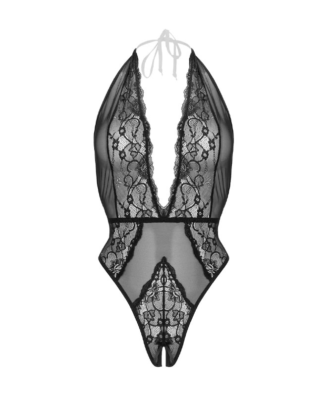 Blondebody, haltermodell med sløyfelukking i halsen. En forførende kombinasjon av sensuelle blonder og gjennomsiktig mesh. Bodyen er åpen i skrittet som definitivt vil gjøre ting ekstra spennende..