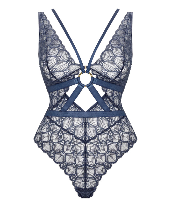 Denne forførende bodyen har høyt snitt, åpne detaljer og trekantformede kopper som fremhever formene dine. Bodyen er blå med gullfargede detaljer, og stroppene har harness-look som gjør at bodyen ser litt røffere ut. Stroppene kan fjernes dersom du er ute etter en klassisk look - her er det bare å kose seg!