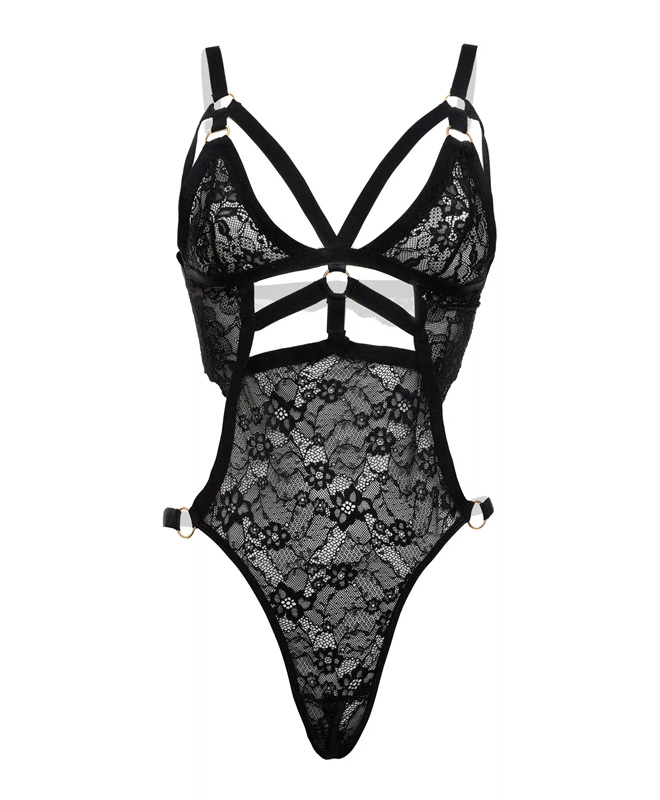 Klar for en frekk kveld? Denne svarte bodyen fra Christine kombinerer delikate blonder med åpne utskjæringer og slanke stropper. Feminint og dristig på én gang. Gullfargede ringer binder sammen stroppene og gir bodyen et sexy, stilrent preg. Blonden er plassert strategisk for å spille med kroppens linjer og fremheve dine vakre former.
