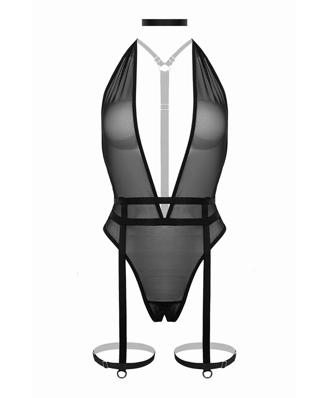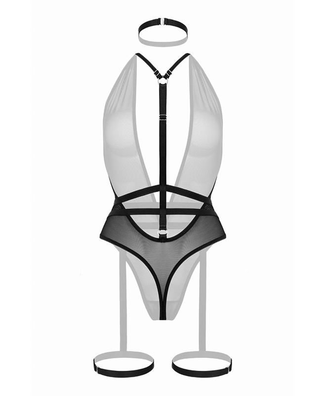 Gwen fra Christine er en frekk og gjennomsiktig teddy laget i sort mesh med dyp utrigning og strappy detaljer i midjen og rundt hoftene. Halsbåndet gir antrekket en dominant touch, mens den åpne fronten trekker fokuset dit du vil ha det. Designet fremhever formene dine med geometriske linjer og en sexy, kroppsnær passform.