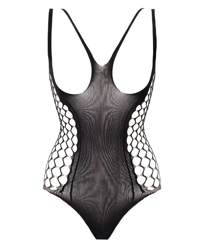 Denne sorte bodysuiten går rett på sak med frekke utskjæringer langs begge sidene. Den er laget i myk, elastisk netting som former figuren tett, med spagettistropper som følger skuldrene lett og lar resten av kroppen skinne. Designet er minimalistisk, men slår hardt: Åpen rygg, høy skjæring og stram passform gir en råsexy look.