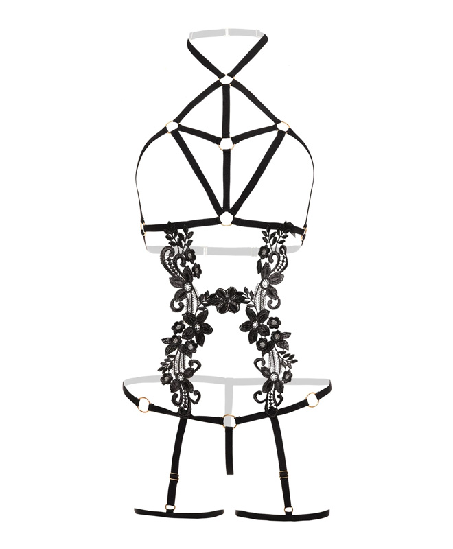 Romantisk BDSM! Dette er et harness med et virkelig unikt design. De elastiske stroppene omfavner kroppen og fremhever hver eneste deilige kurve på kroppen din med lekne bånd og metallringer, mens de elegante blomsterbroderiene gir deg en luksuriøs og romantisk look.
