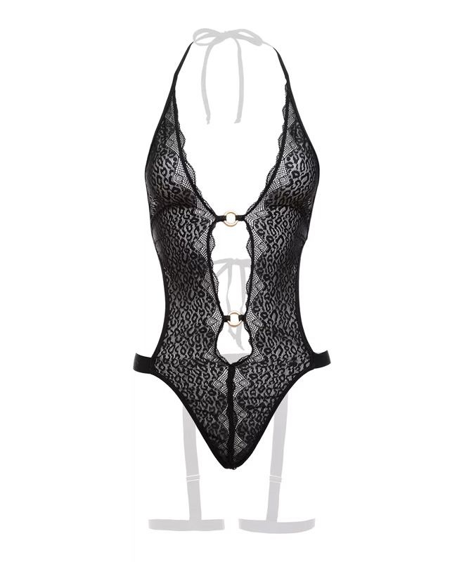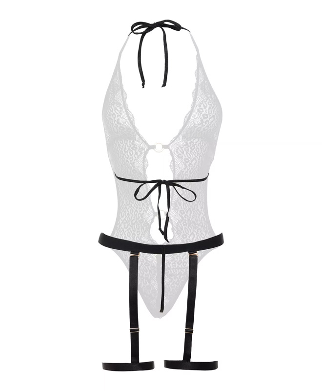 Drakten er laget av blonder, og har stropper som går i kryss over baken for en ekstra forførende look. Den har dyp utringning, og stropper man fester over lårene. Nevnte vi at den også har åpning i skrittet? Her er det bare å slå seg løs! Kun håndvask.