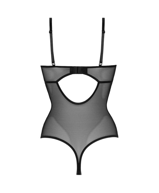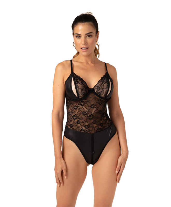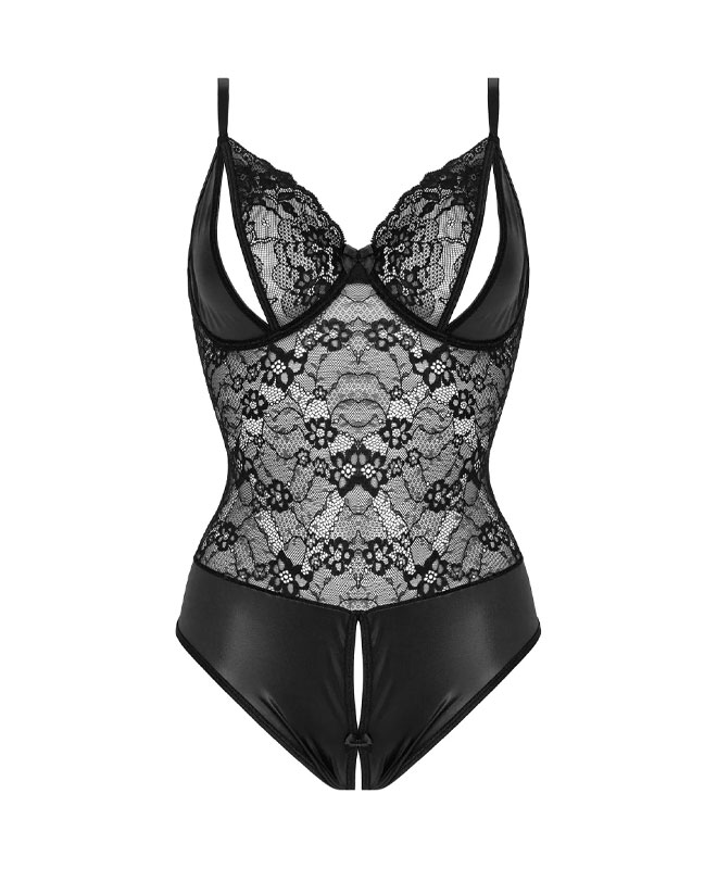 Spicy, sensuell body fra merket Christine le Duc. Den forførende kombinasjonen av blonder og mykt wetlook-materiale gjør denne bodyen helt spesiell! Dristige åpninger i både BH-kopper og skritt.