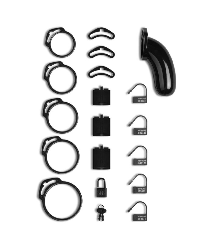 Åpningen foran gjør at brukeren kan urinere uten å fjerne buret. Dette flotte settet kommer med 5 ringer i forskjellige størrelser for en perfekt passform (4,5 - 6,5 cm). Den inneholder også en metallhengelås med 2 nøkler og 5 plastnummererte hengelåser.