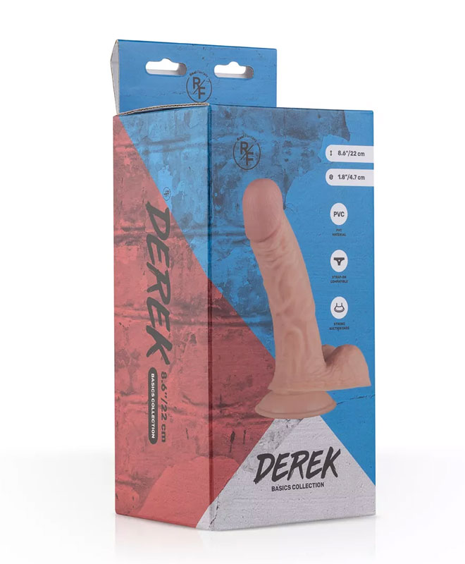 Møt Derek! Derek er en realistisk dildo laget av mykt og fleksibelt materiale. Dildoen fra merket Real Fantasy har et skaft med realistiske årer og er lett bøyd.
