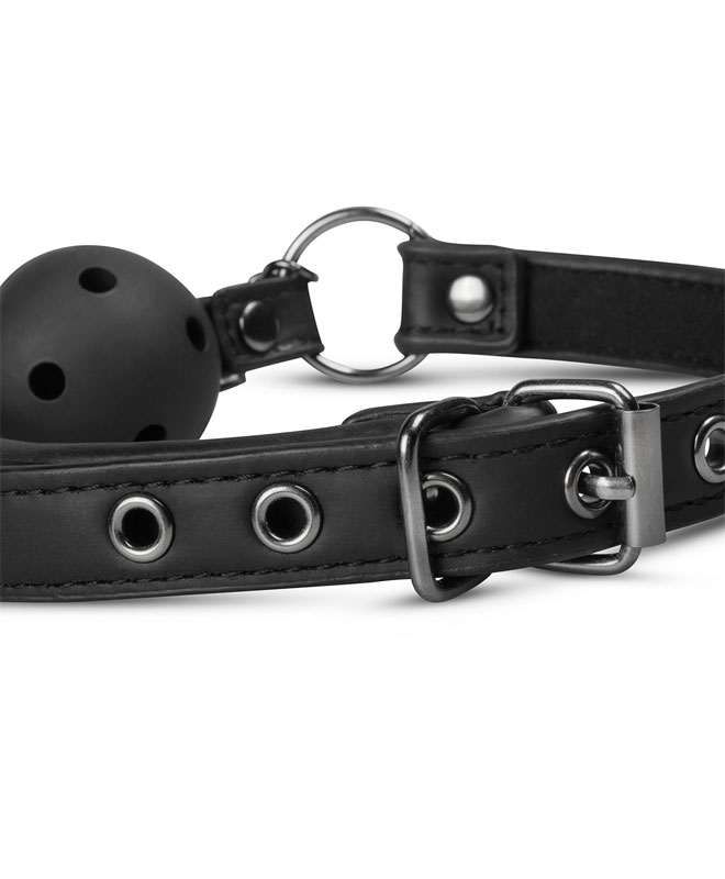 Denne svarte munnballen er laget av glatt plast med lufthull. Ballen er luktfri og smakløs, så brukeren kan glede seg over den uten bekymringer.