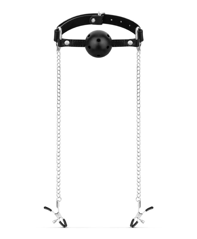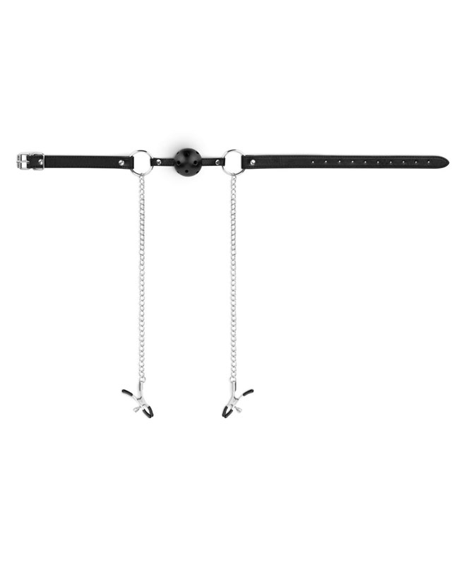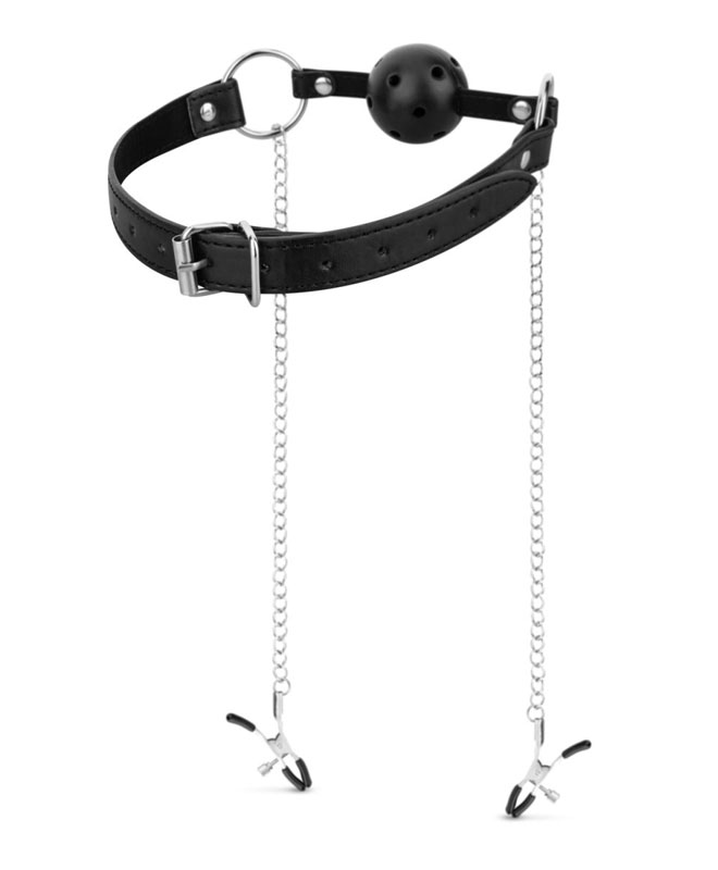De justerbare klypene lar deg velge akkurat hvor hardt de skal bite, slik at du kan starte mykt og skru opp intensiteten når kåtheten tar over. Ballgagen fyller munnen og gir deg den deilige følelsen av å være helt submissive.