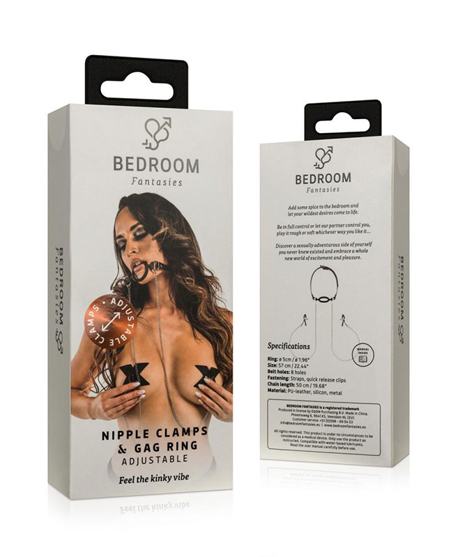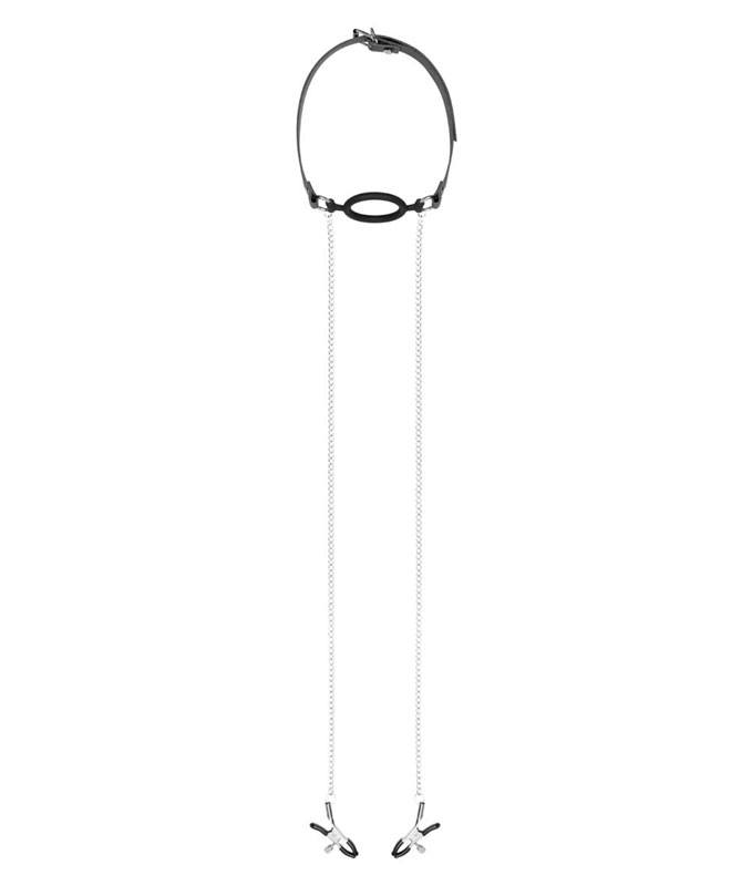 Utforsk nye grenser av smerte og nytelse med denne spennende gag ringen med brystklemmer! Gaggen har en diameter på 5 cm og er laget av behagelig silikon.