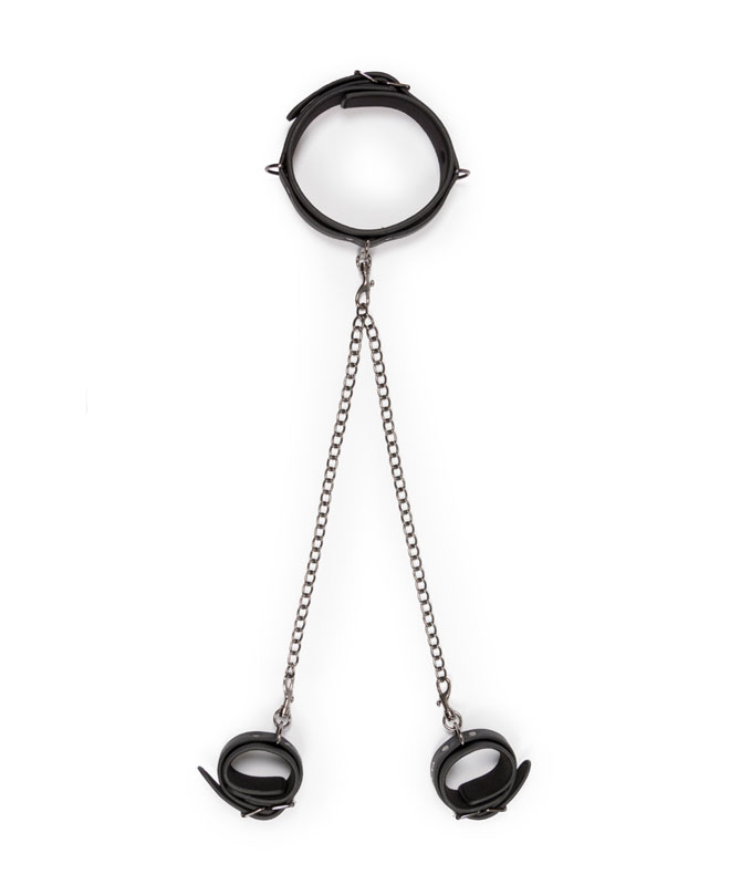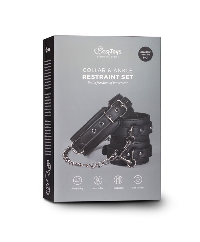 Klar for en frekk bondagelek som tar deg ned på knærne? Dette halsbåndet med tilhørende ankelmansjetter fra EasyToys Fetish er laget i svart kunstlær med metallkjeder som binder hals og ankler sammen. Det gir deg både en rått og deilig aften, der metall og lær spiller på makt og kontroll. Det kinky designet sitter tett og sexy rundt kroppen, og passer perfekt for deg som liker det visuelt intenst.