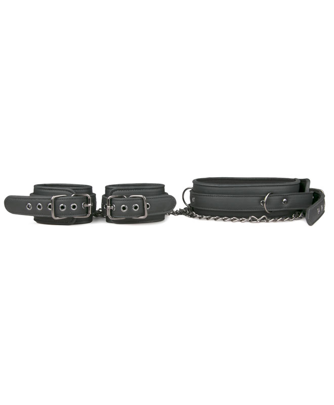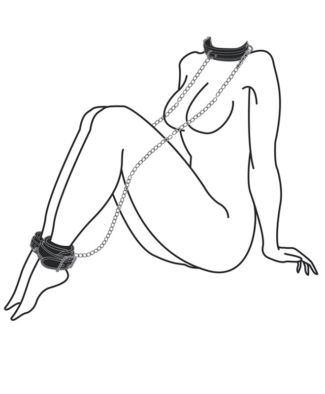 Halsbåndet kan justeres fra 35 til 53 cm, og mansjettene passer ankler fra 13 til 30 cm, her får du fleksibilitet uansett kroppsfasong. Metallkjeden mellom er 80 cm lang og kobler alt sammen på en måte som holder partneren din akkurat der du vil ha dem. Kunstlæret gir en god følelse mot huden og holder formen godt under lek.