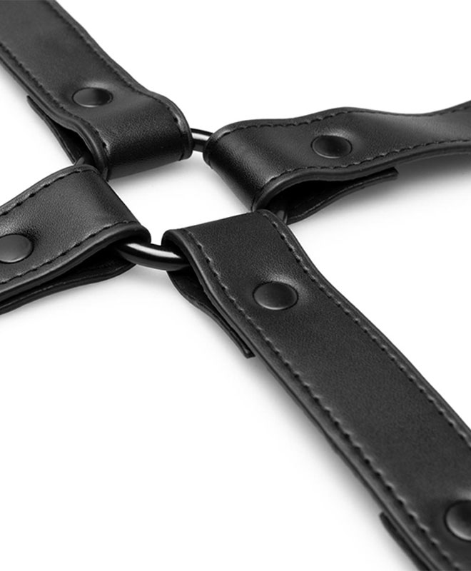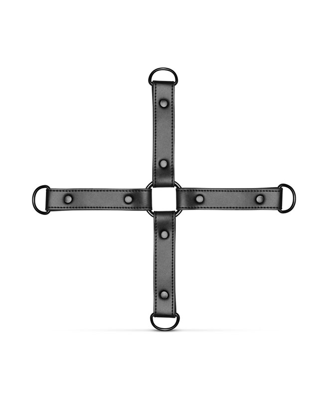 Gi liv til dine dypeste fantasier, og ta full kontroll over partneren din ved hjelp av denne hogtie-en fra Bedroom Fantasies! Settet holdes sammen av en massiv O-ring med fire remmer som hver har en solid D-ring i metall du kan feste hånd- og ankeljernene eller annet bondageutstyr til.
