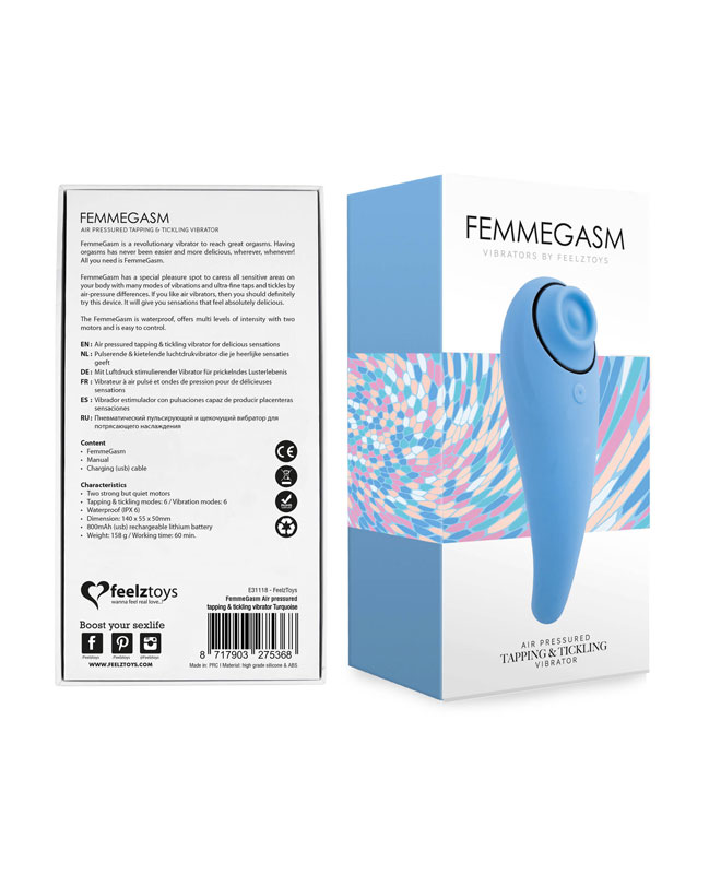 Femmegasm er et to-i-én sexleketøy. På den ene siden har du en helt ny «tæppe»-effekt, som har tatt verden med storm og på andre siden kan du nyte klassiske vibrasjoner. Femmegasm tapper, kiler og kjærtegner de aller mest følsomme områdene på kroppen din med mange vibrasjonsmodus og pulseringer. Hvis du liker luftvibratorer, bør du absolutt prøve denne vibratoren! Den er annerledes, og vil gi deg en helt ny type stimuli.
