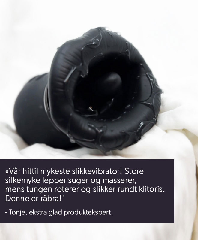 Vår hittil mykeste slikkevibrator! Store silkemyke lepper suger og masserer, mens tungen roterer og slikker rundt klitoris. Denne er råbra!" - Tonje, ekstra glad produktekspert