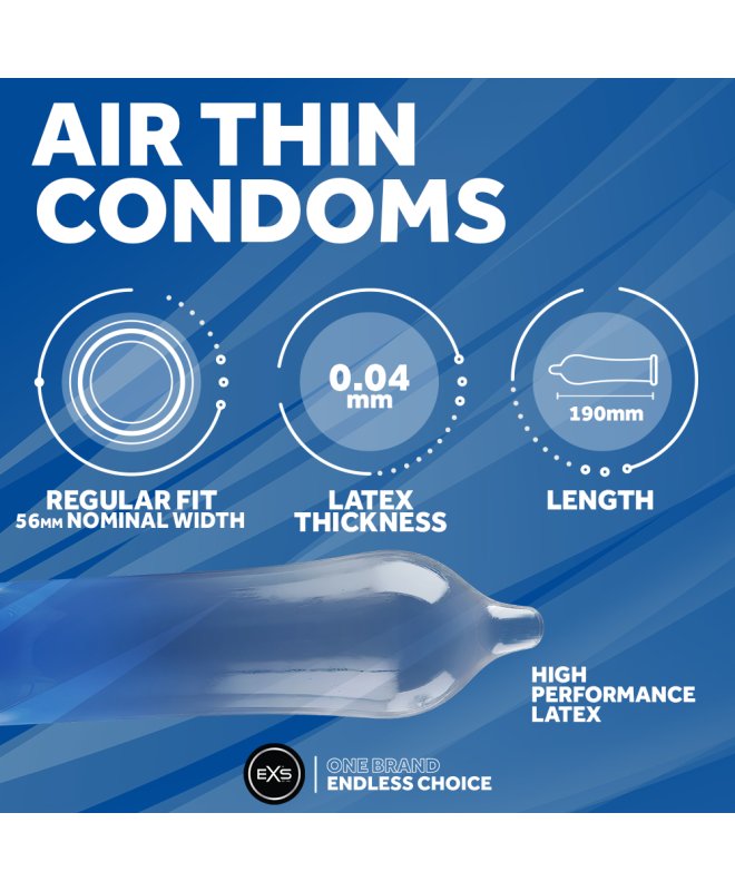 Med bare 0,045 mm tykkelse er EXS Air Thin blant de tynneste latekskondomene i verden, så du får maks følsomhet uten å gå ned på trygghet. Den behagelige passformen og silikonbaserte glidemiddelet gjør dem enkle å rulle på og av, helt uten latekslukt eller smak.