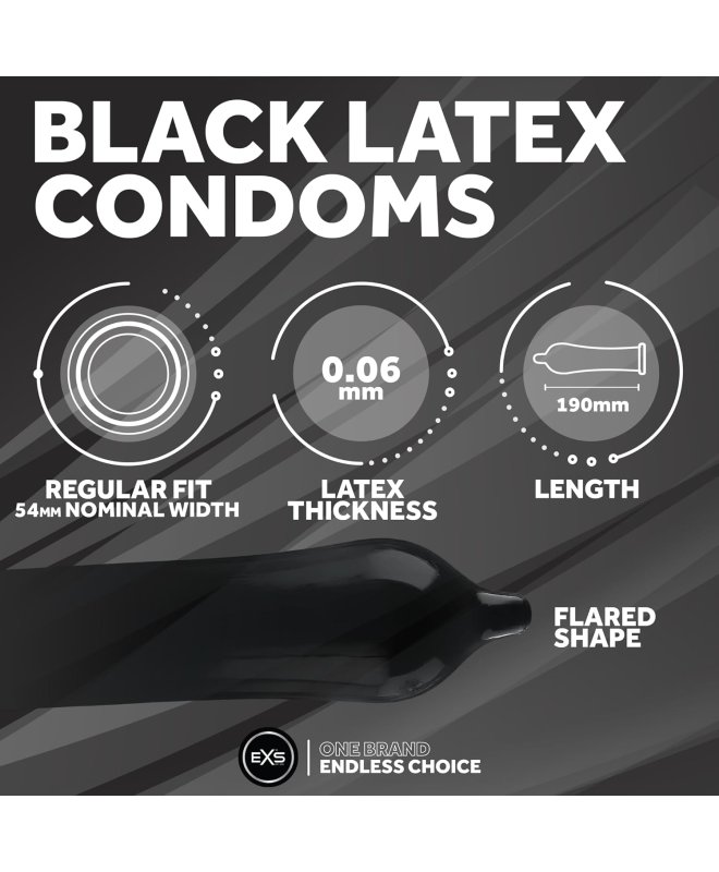 EXS Black Fantasy er kondomer i helt sort kvalitetslateks som gir et visuelt kick hver gang. Den litt bredere toppen sørger for komfort mens den mørke fargen preger stemningen til noe mer intenst. Ferdig smurt med silikonbasert glidemiddel og uten latekslukt, så alt står på den kinky følelsen og den mørke stilen.