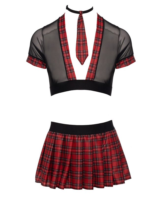Settet består av en liten, stram crop top, et uskyldig slips som kan festet rundt halsen og et veldig kort miniskjørt med klassiske røde og sorte ruter. Det elastiske materialet gir deg suveren passform og optimal komfort, akkurat det flinke piker trenger!