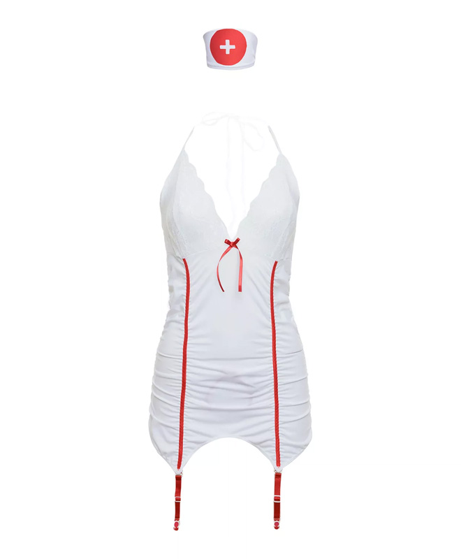 Hodebåndet med rødt kors og den hvite strengtrusen gir antrekket den klassiske sykepleierfinishen. Den er hot, frekk og klar for action, og garanterer en kveld som ikke glemmes med det første.