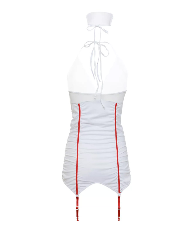 Klar for en frekk lekenatt i sykepleierkostyme? Healing Heartbreaker fra Christine kombinerer hvitt og rødt i et sexy, kroppsformet design. Toppdelen har en dyp utringning dekorert med blonder over brystene, og de røde stripene trekker blikket hele veien ned langs kroppen.