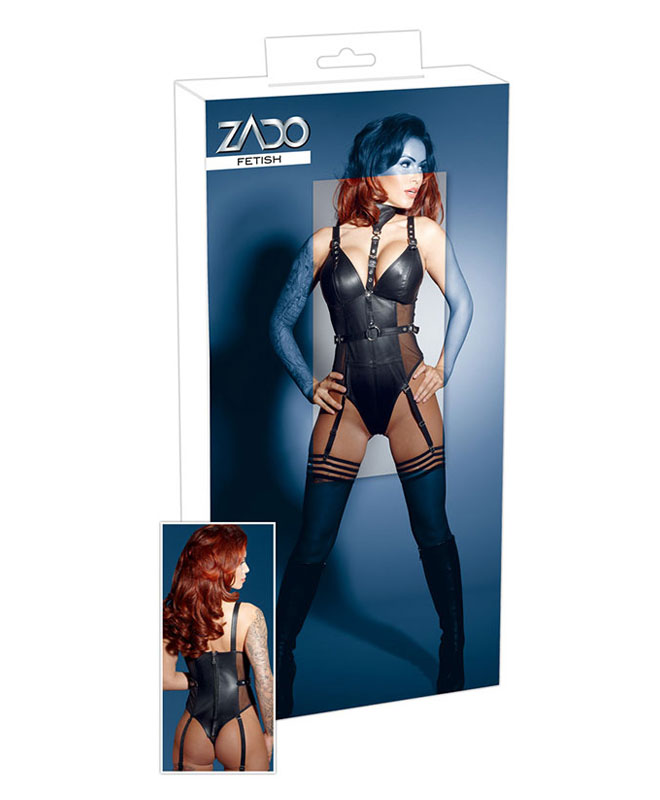 Sort body i ekte nappalær med tøffe remmer og metallringer som oser sex! Alle remmene er justerbare for perfekt passform, bodyen har glidelås i ryggen som gjør det enkelt å ta den av og på. Settet inkluderer fire avtagbare strømpeholdere.