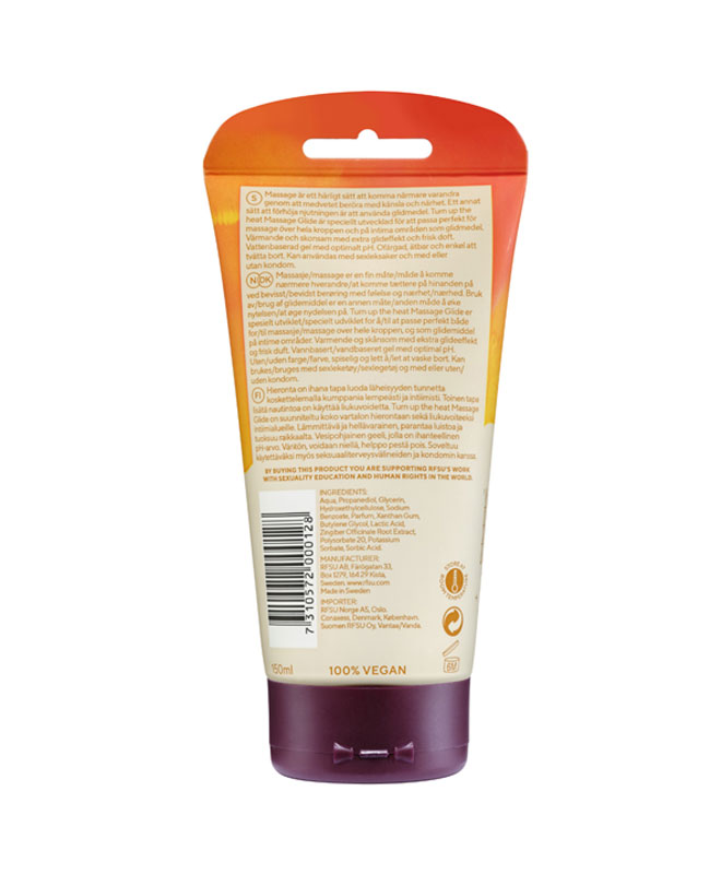 Turn Up The Heat fra RFSU er en kombinert massasjegel og glidemiddel med varmende effekt. Passer perfekt til massasje over hele kroppen og på intime deler som glidemiddel. 3 in 1 Turn Up The Heat er en skånsom, vannbasert gele med rett pH og frisk duft. Inneholder ingefær for en varmende effekt. Kan brukes med eller uten kondom.