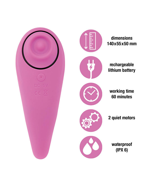 Femmegasm er en revolusjonerende stimulator som du neppe har kjent maken til! Den tapper, kiler og kjærtegner de aller mest følsomme områdene på kroppen din med mange vibrasjonsmodus og pulseringer. Hvis du liker luftvibratorer, bør du absolutt prøve denne vibratoren! Den er annerledes og vil gi deg en helt ny type stimuli, men «halen» er en klassisk vibrator så du kan variere stimuleringen.