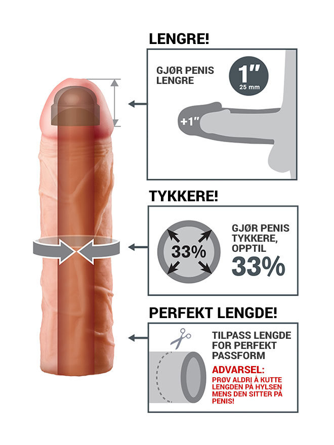 Fantasy X-Tensions kommer i flere lengder og tykkelser, velg den som passer deg og din partner best - så kan du gi alt du har, og mer til! Hver hylse er myk og elastisk slik at den tilpasser seg din lengde og tykkelse. Lengden på hylsen kan også klippes ned for en bedre passform.