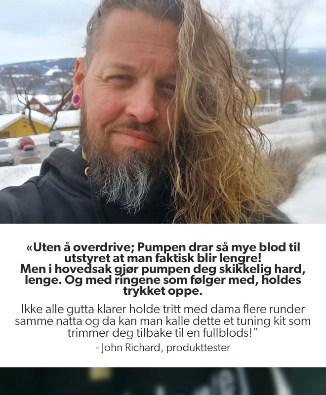 "Større penis på få sekunder, hvorfor skal man IKKE bruke en penispumpe? Penis blir knallhard og den holder seg slik etter sprut også. Jeg er overrasket over hvor stor effekt den hadde, jeg fikk en megakuk og det er jeg ikke vandt til!" - Thomas, svært fornøyd testperson