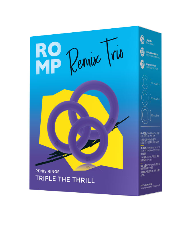 ROMP Remix Trio er en pakke med tre slitesterke, superstretchy ikke-vibrerende penisringer for å støtte utholdenhet og gi deg hardere ereksjoner. De er laget for å passe de aller fleste størrelser og former, og du velger selv om du vil bruke en, to, eller alle tre i ulike kombinasjoner for økt solo- og partnernytelse.