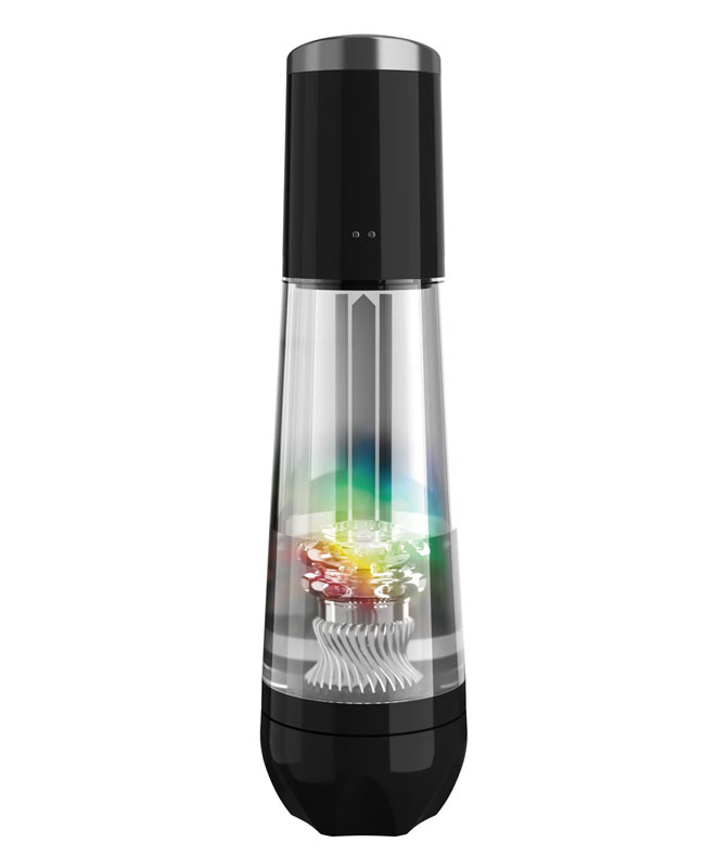 Du setter deg godt til rette, glir inn i den myke sleevens teksturer og hører maskinen starte. Et sug trekker deg inn, vibrasjonene setter inn, og samtidig lyser LED-lysene opp hele skaftet. Du ser deg selv bli sugd og pumpet i sanntid, gjennom den gjennomsiktige hylsen og det føles like intenst som det ser ut.