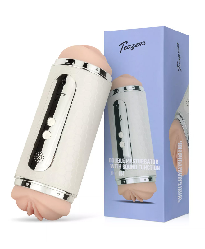 Opplev dobbelt så mye spenning med denne innovative masturbatoren! Denne elektriske masturbatoren fra Teazers har et stilrent, hvit utside med struktur for godt grep, kombinert med kromdetaljer og et brukervennlig kontrollpanel. På innsiden finner du to myke silikonåpninger, én modellert etter en munn og en etter en vagina, begge i naturtro farge og med deilig realistisk følelse.