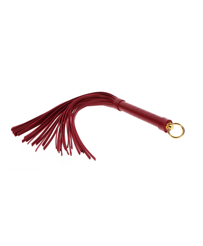 Denne store pisken fra Taboom kombinerer rødt kunstlær og gullfargede detaljer for en visuell punch som oser av makt og lyst. Håndtaket ligger godt i hånden og matcher de røde lange piskestrimlene som danser sensuelt over hud. Den gyldne toppen gjør det enkelt å henge den opp eller vise fram.