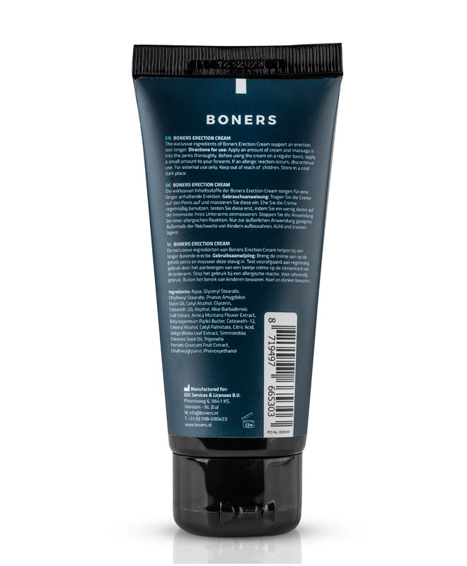 De spesielle ingrediensene til Boners Erection Cream hjelper til med å opprettholde ereksjonen din. Ved å massere penis regelmessig med kremen, blir hudvevet mykere og blodstrømmen inne i penis stimuleres. Det vil ta kortere tid før penisen din blir hard og ereksjonen din vil vare lenger.