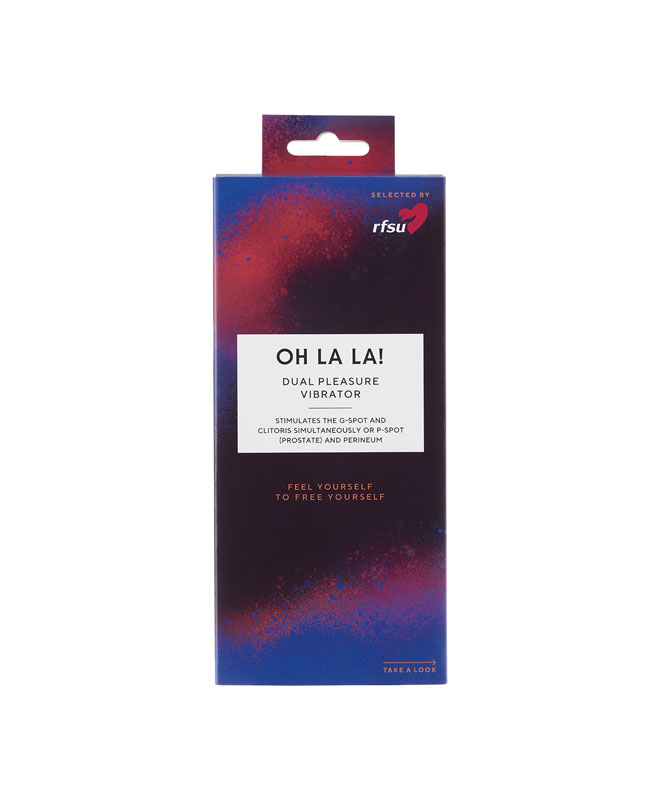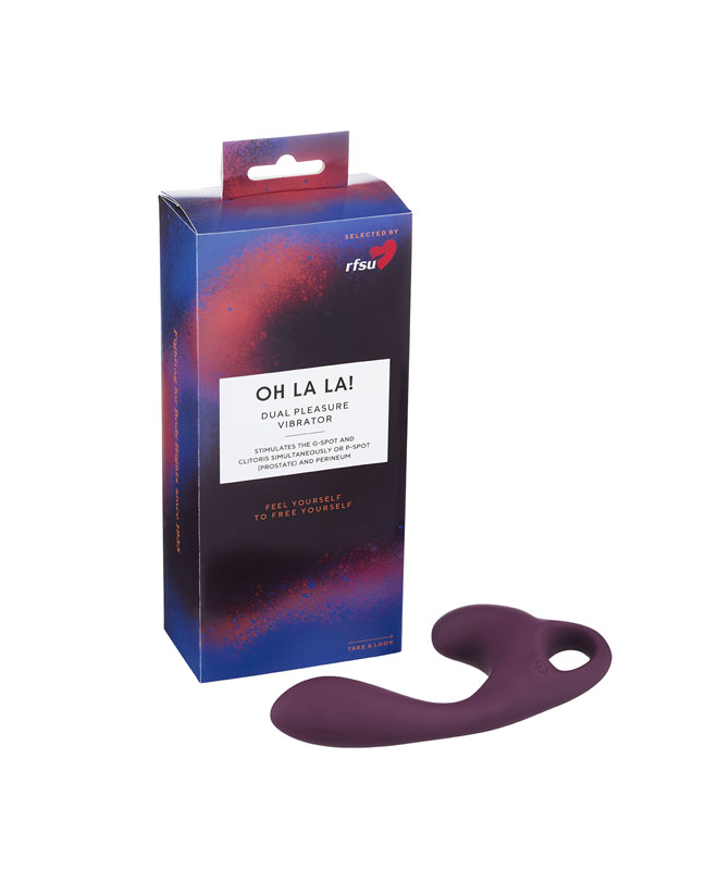 Oh la la! fra RFSU er en kraftfull vibrator som gir dobbel stimulering. Den lengre delen føres inn vaginalt eller analt for å stimulere G-punkt eller P-punktet, mens den kortere delen ligger mot klitoris eller perineum (mellomkjøttet).