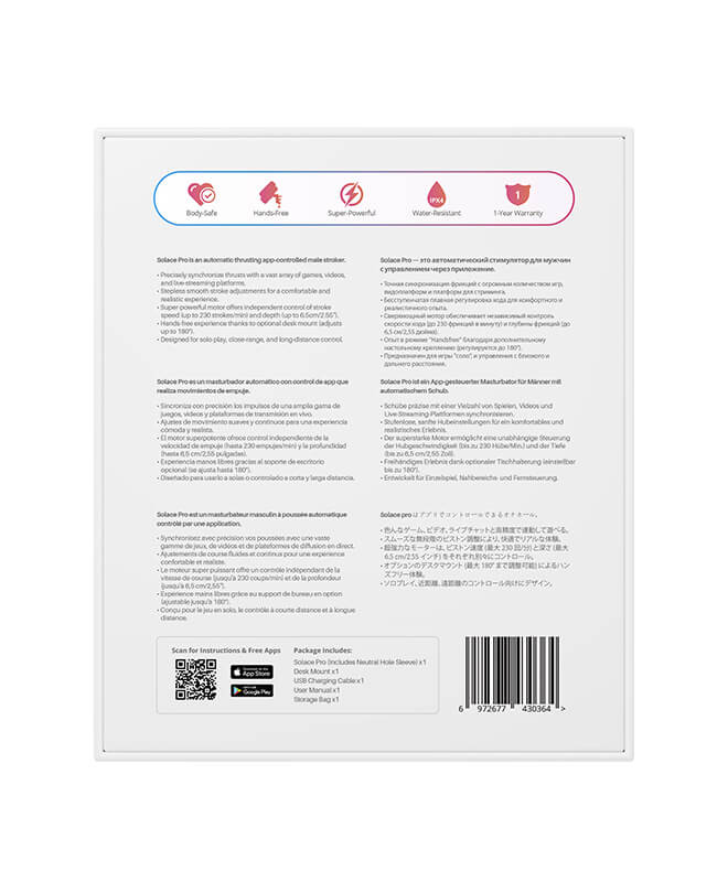 Solace Pro er ekstremt kraftig, superrealistisk og utrolig effektiv med sin naturlige hylse som beveger seg inn og ut opptil 300 ganger i minuttet! Du kan enkelt justere hastighet og støtlengde selv, eller la herrevibratorens avanserte AI styre bevegelsene etter handlingen på skjermen. Solace Pro inkluderer et kraftig bordfeste slik at du kan nyte intens stimulering håndfritt!