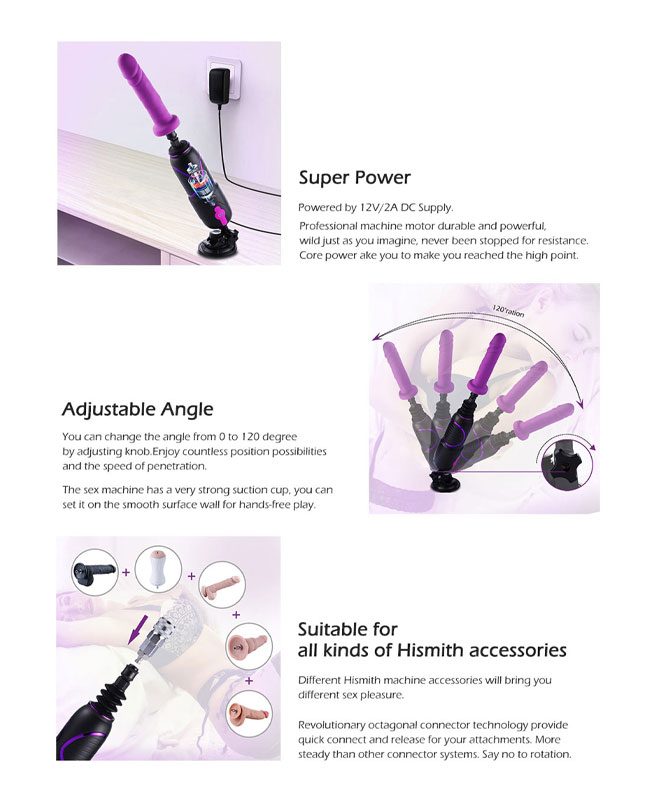 Maskinen kan stilles i 0-90 graders vinkel, og treffe akkurat det hullet du vil. Sexmaskinen er kompatibel med alle Hismith sine KlicLok og QuickAir adaptere og tilbehør. Den lille sexmaskinen gir deg opptil 5 cm støtdybde!