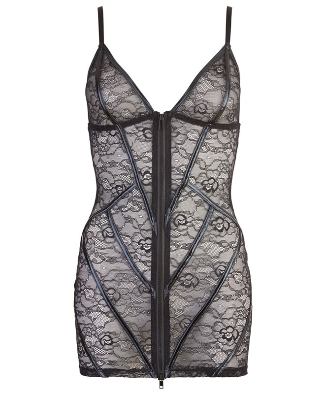 Vil du gi dem noe å stirre på? Denne minikjolen kombinerer sexy blonder med dristige detaljer i wetlook som skrår tvers over framsiden. De sorte blondene er gjennomsiktig, mens lakkerte stripene setter en frekk kontrast. Spaghettistroppene tilfører et feminint preg og gjør at kjolen sitter pent over skuldrene.