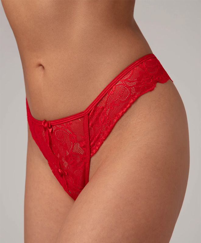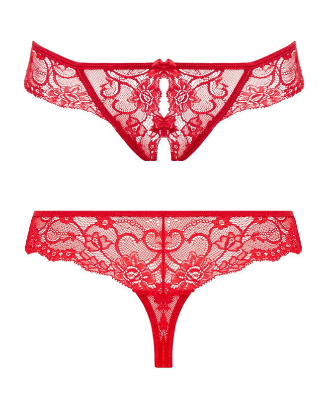 Denne elegante stringtrusen i røde blonder er både enkel og herlig pirrende. De delikate blondedetaljene gir en feminin og sensuell look, mens åpningen i skrittet inviterer til lek og utforsking.
