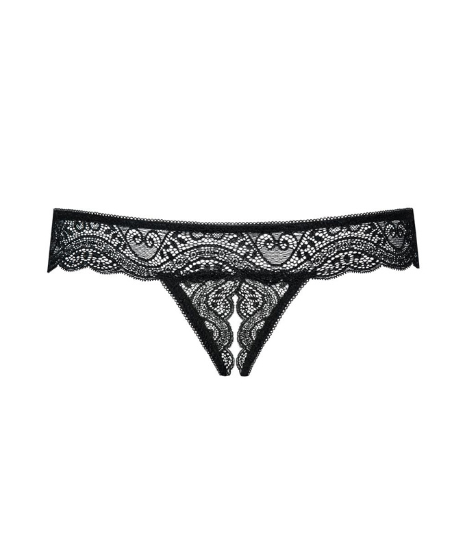Klar for noe frekkere enn vanlig? Denne sorte tangatrusen fra Obsessive kombinerer delikate blonder med et åpent skritt for en sexy, visuell effekt. Gjennomskinnelig stoff med florale blondedetaljer rammer inn hoftene, mens den dristige åpningen trekker blikket dit du vil ha det. Den klassiske fasongen sitter lavt og sensuelt på hoftene.